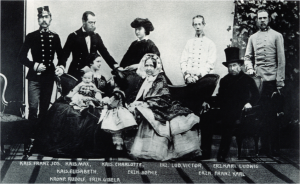 Franciszek Józef (z lewej) z żoną, dziećmi (arcyksiężniczką Gizelą i arcyksięciem Rudolfem) oraz innymi członkami rodziny, 1861