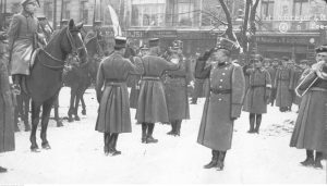 Dowódca 1 Pułku Strzelców Wielkopolskich generał Daniel Konarzewski raportuje generałowi Józefowi Dowborowi-Muśnickiemu. Widoczny także m.in. generał Filip Stanisław Dubiski |
