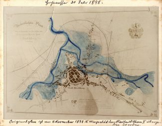 Na niebiesko zaznaczony obszar zalanej Jeleniej Góry podczas powodzi w 1897 roku : fot. AP Wrocław, Oddział Jelenia Góra |