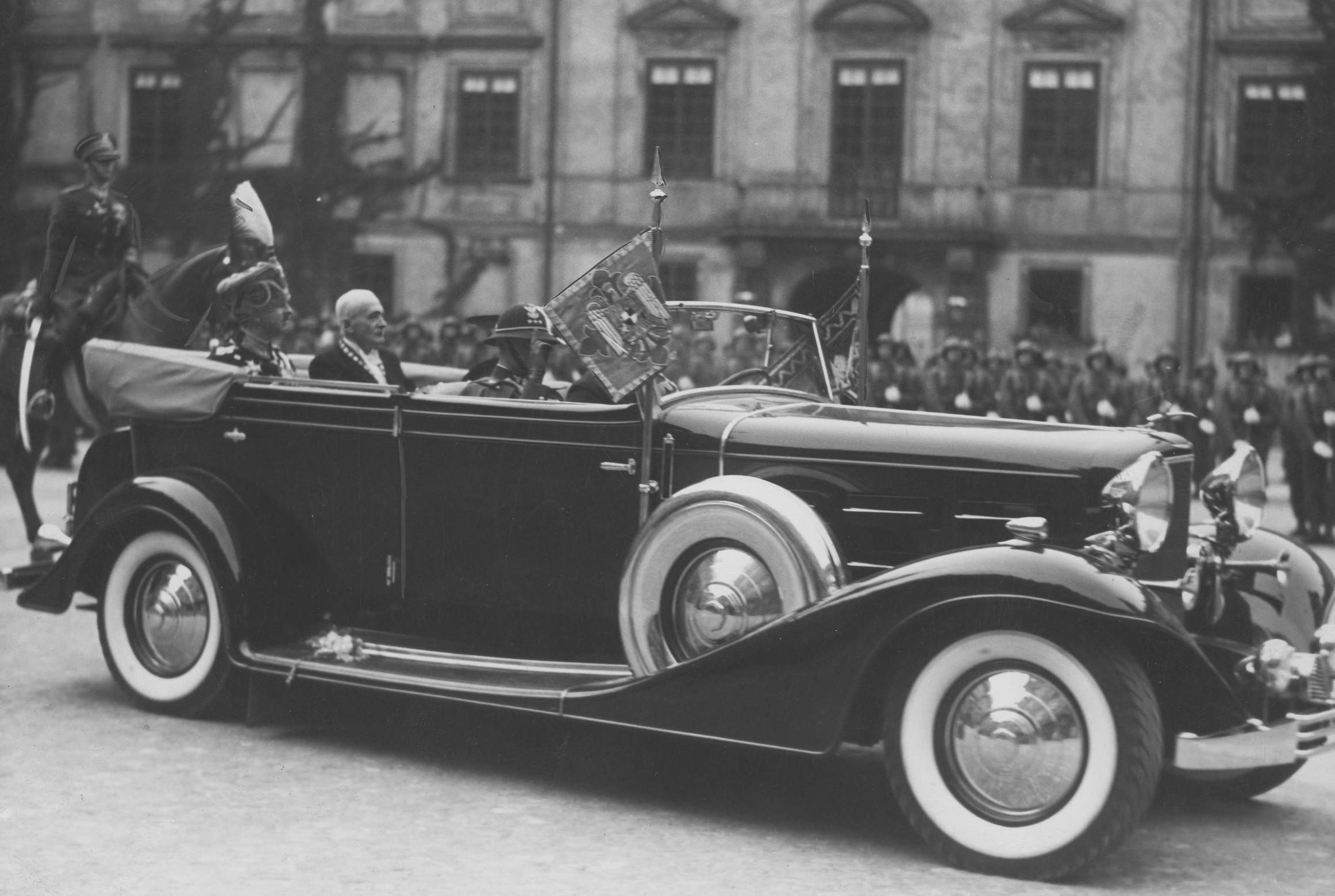 Prezydent RP Ignacy Mościcki oraz król Rumunii Karol II w samochodzie polskiego prezydenta marki Rollce-Royce |