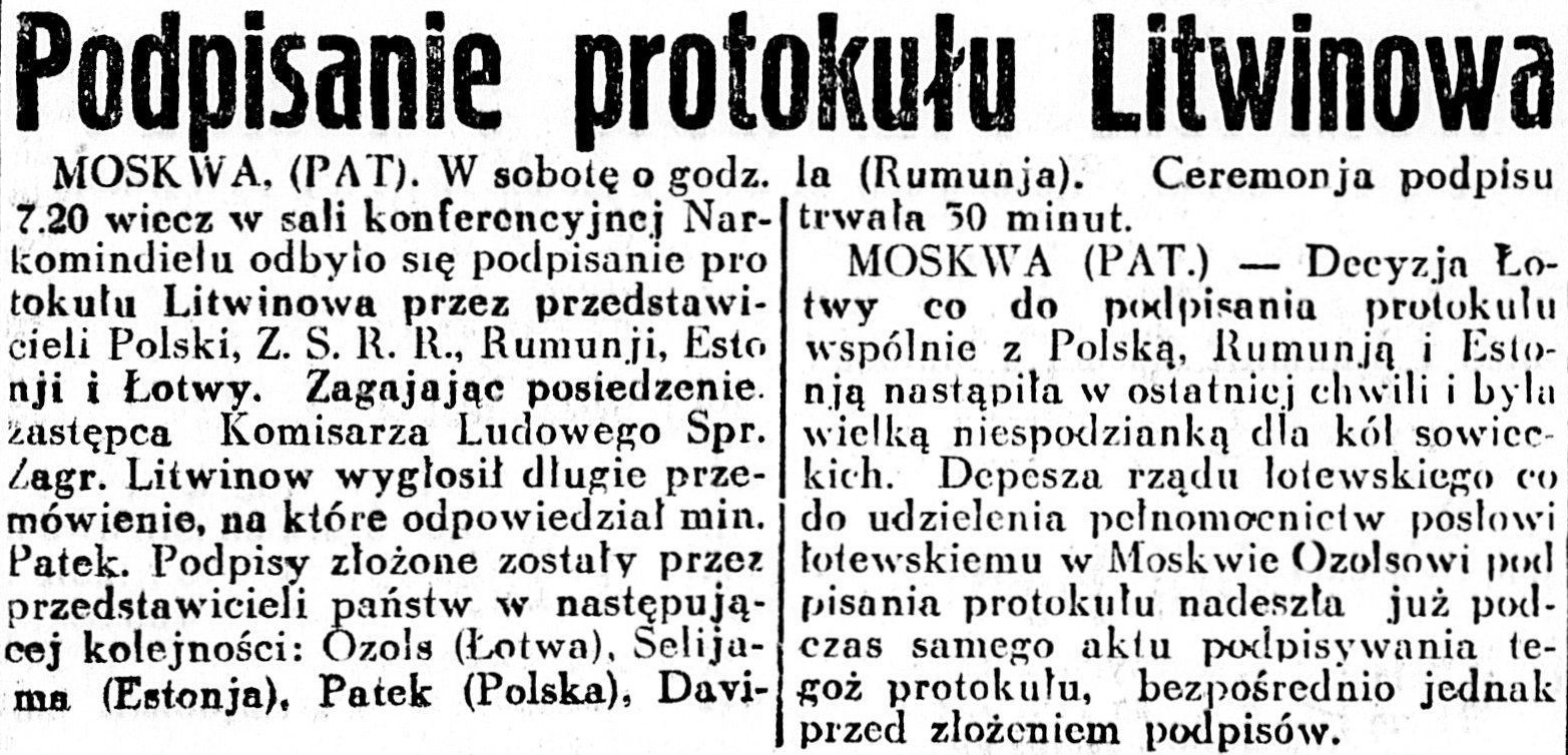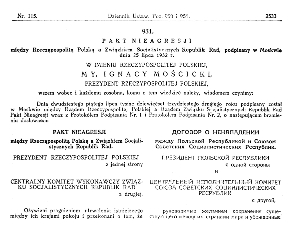 - Pakt nieagresji między Rzecząpospolitą Polską a Związkiem Socjalistycznych Republik Rad, podpisany w Moskwie dnia 25 lipca 1932 r. (Dz.U. 1932 nr 115 poz. 951).