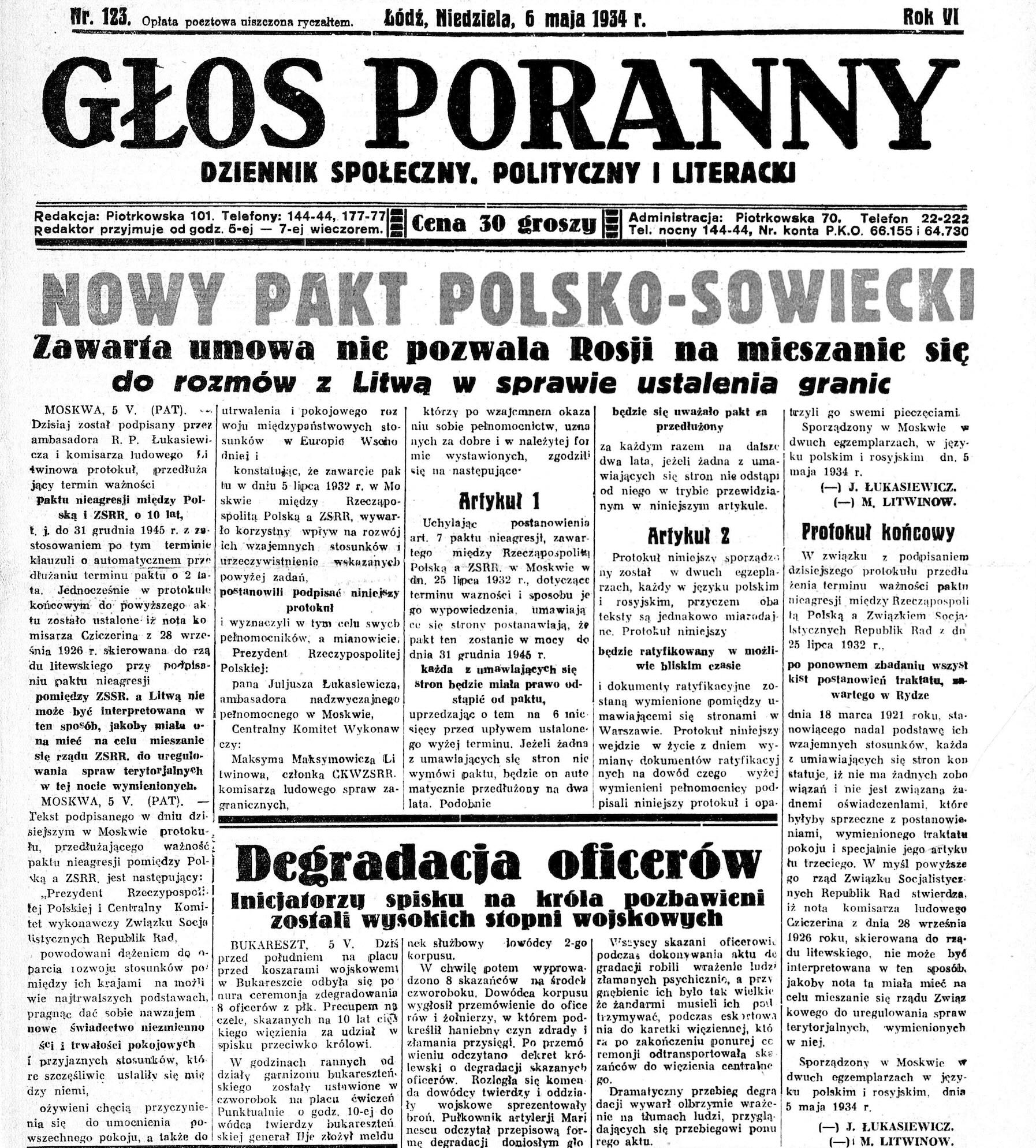 - Protokół podpisany w Moskwie dnia 5 maja 1934 r. między Rzecząpospolitą Polską a Związkiem Socjalistycznych Republik Rad o przedłużeniu Paktu Nieagresji między Rzecząpospolitą Polską a Związkiem Socjalistycznych Republik Rad, podpisanego w Moskwie dnia 25 lipca 1932 r. (Dz.U. 1934 nr 53 poz. 487).