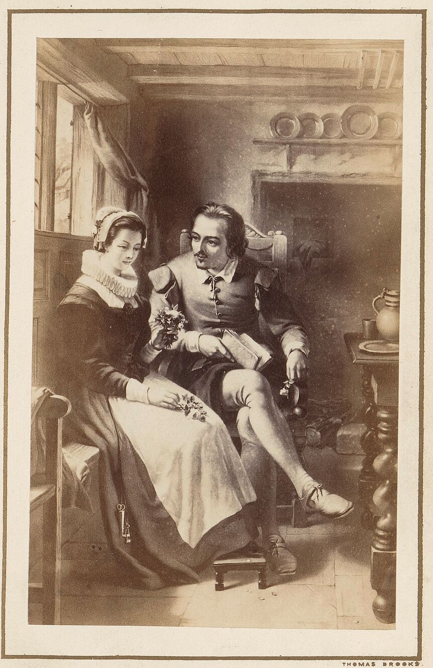 XIX-wieczna niemiecka rycina przedstawiająca Szekspira jako ojca rodziny w otoczeniu dzieci, które z zachwytem słuchają jego opowieści. Jego żona Anna jest przedstawiona po prawej stronie, szyjąc ubranie