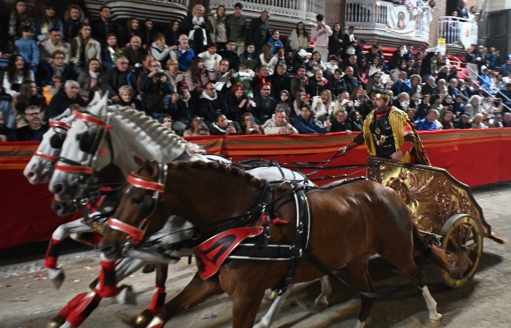 Fernando López Miras, szef rządu Wspólnoty Autonomicznej Murcja, po raz trzeci z rzędu wcielił się w cesarza Teodozjusza I Wielkiego i poprowadził czterokonna kwadryge w galopie przez ulicę Juana Carlosa I, w ramach słynnego biblijno-pasyjnego korowodu bractwa Paso Blanco.